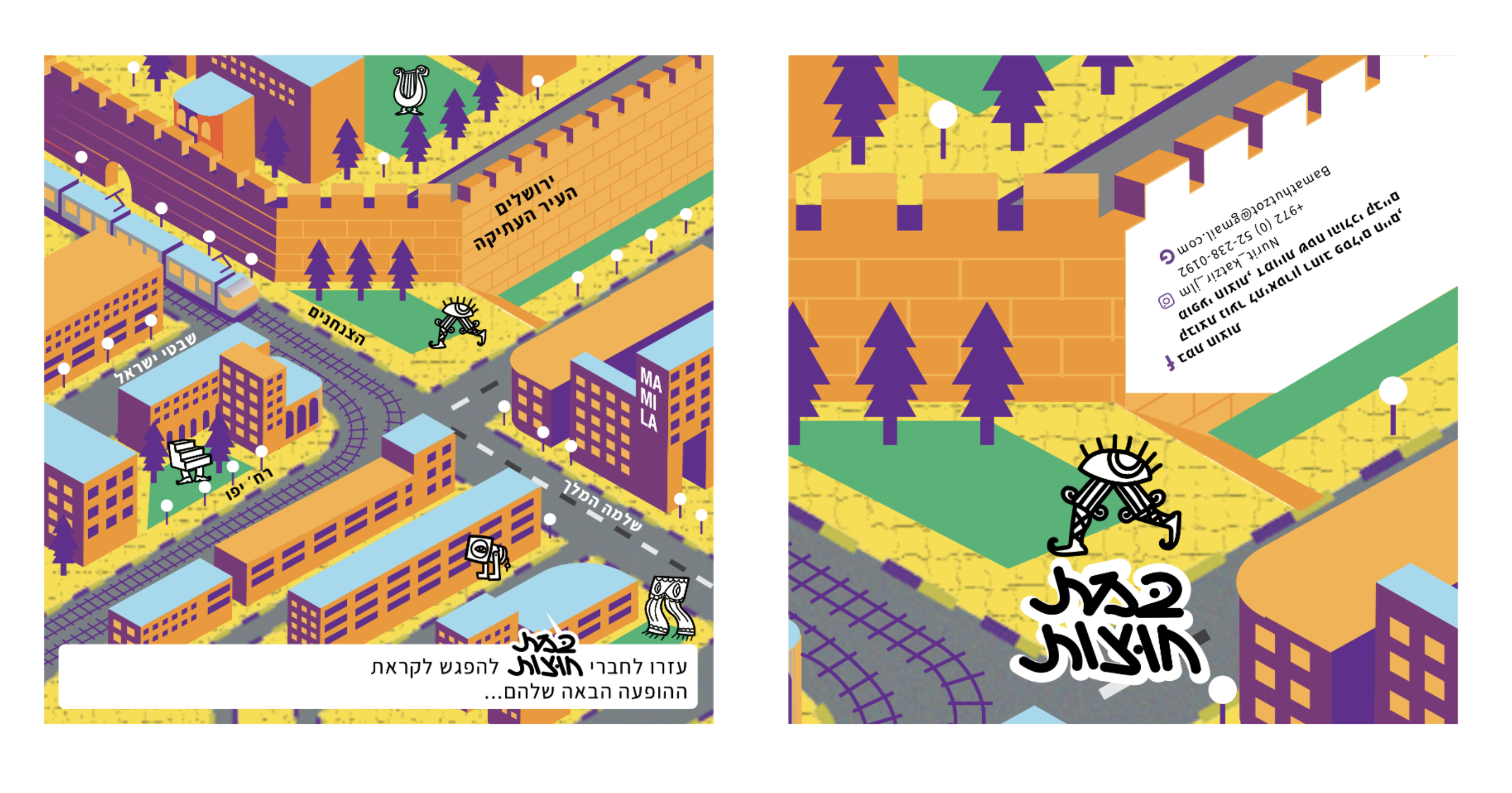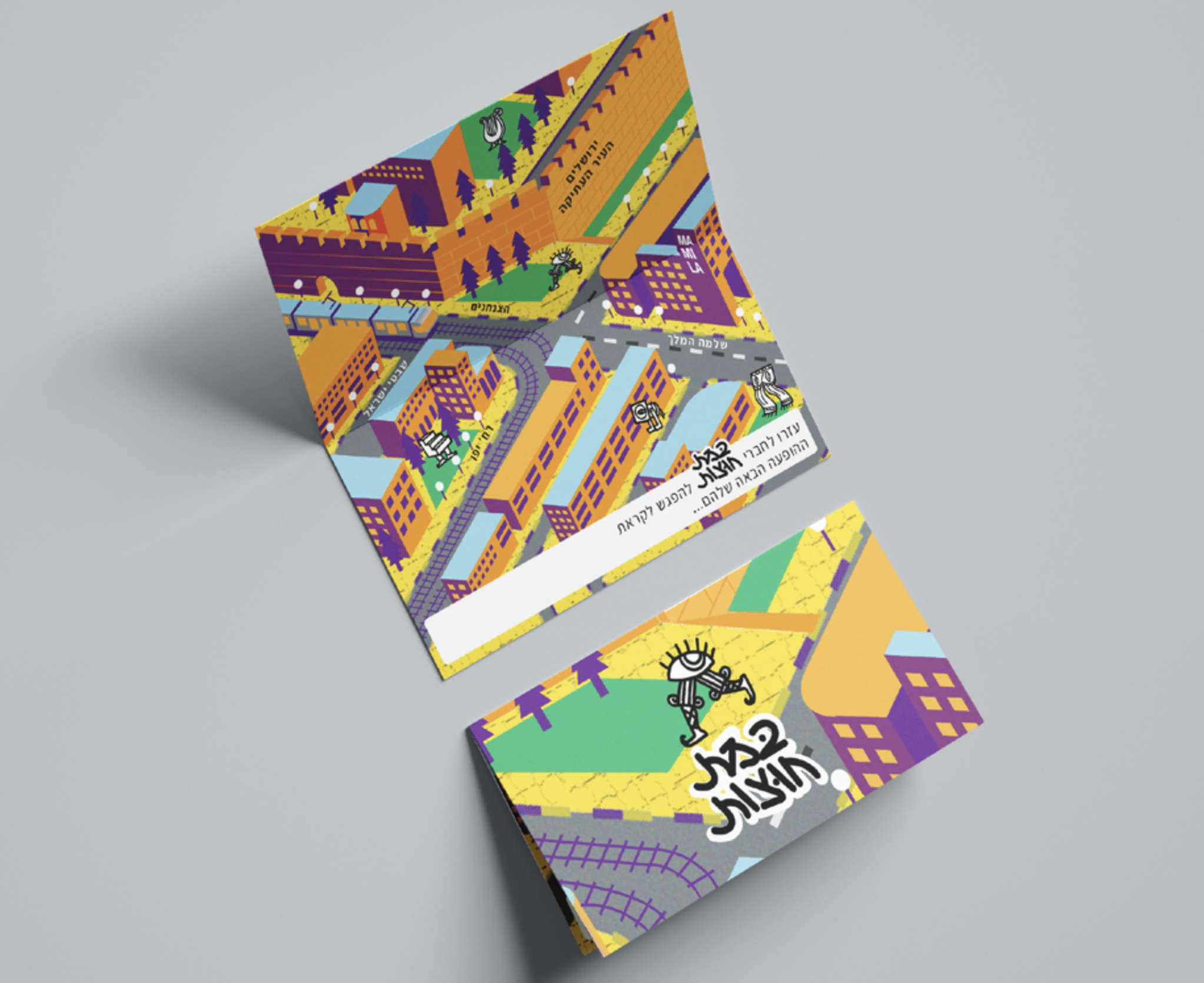 The visual identity for “Bamat Hutzot” (Outdoor Stage) — a theater collective that brings performances into public spaces. The branding blends the spirit of traditional theater with the energy of the city, resulting in a playful yet professional identity that invites people to experience art beyond the stage — out in the streets.
